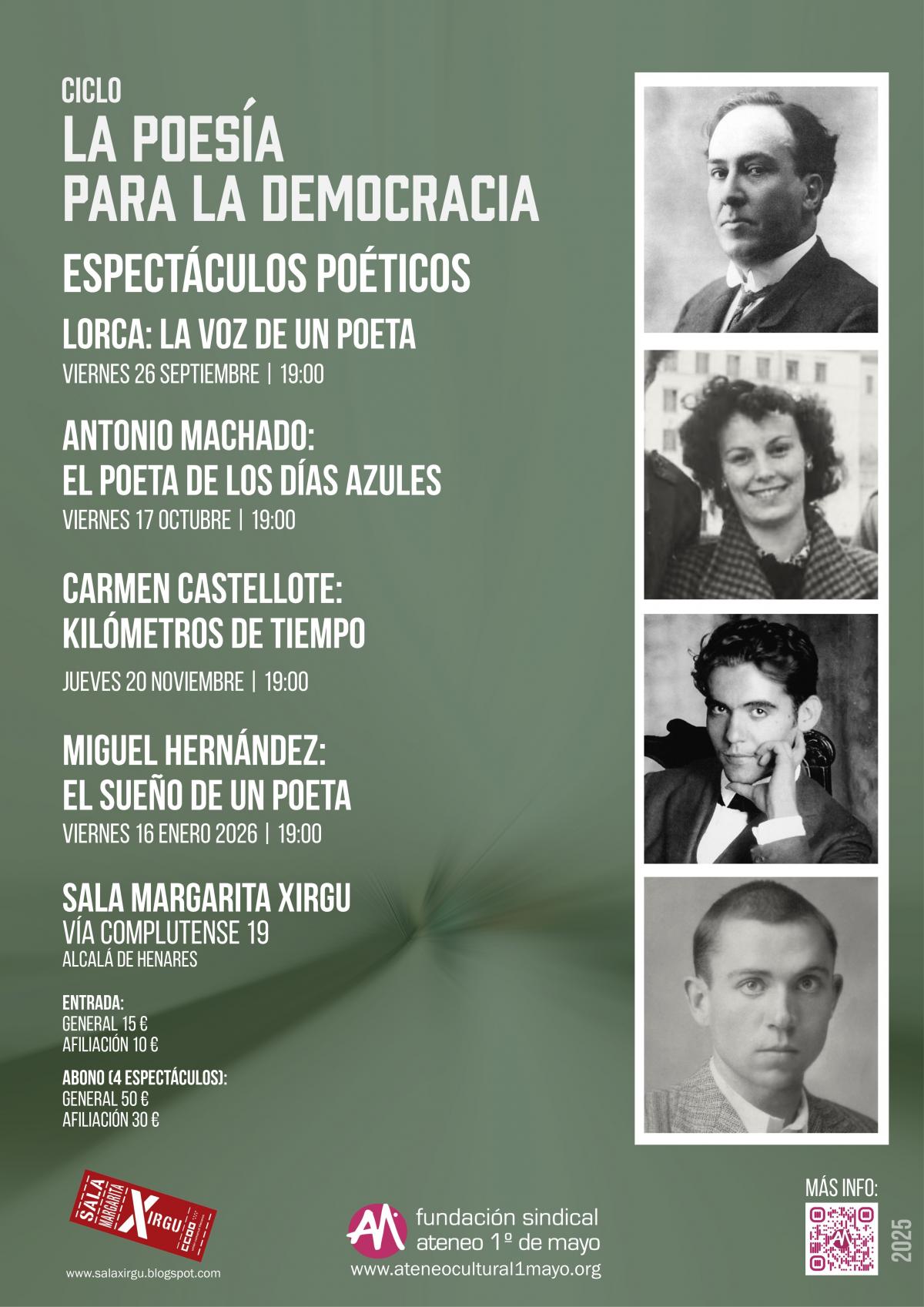 Bajo la denominación La poesía para la democracia, proponemos un homenaje a la “palabra en el tiempo”, a las voces de las y los poetas, en el compromiso con la democracia y la libertad. Consistirá en una serie de mesas redondas y de espectáculos en los que escucharemos las voces de Federico García Lorca, Antonio Machado, Carmen Castellote y Miguel Hernández. Debatiremos con poetas consagrados y con nuevas voces, quienes han hecho de su vocación un compromiso político y social: Luz Olier, Carlos Olalla, Manuel Rico, Manuela Temporelli