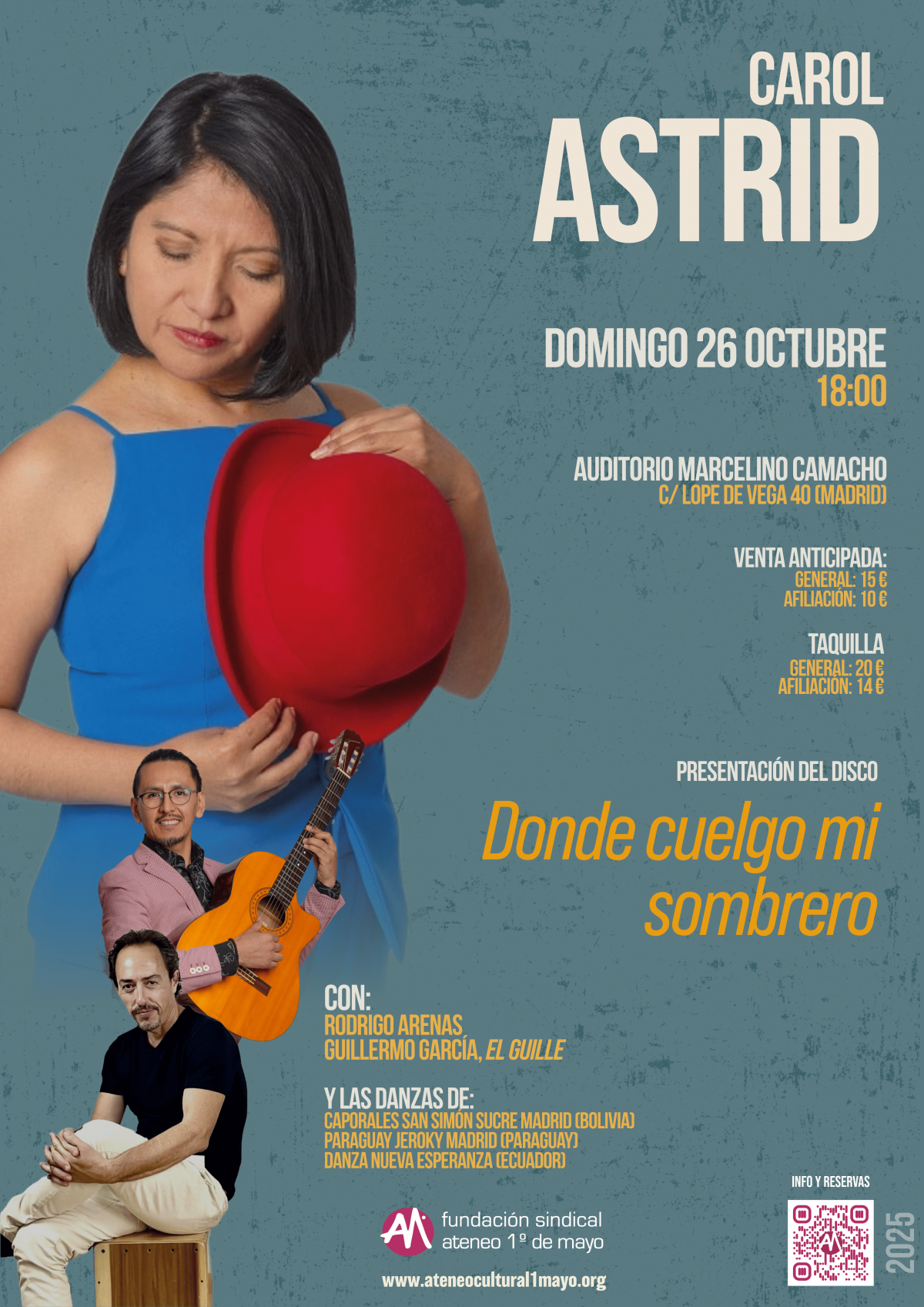 Carol Astrid viene a presentarnos su primer trabajo discográfico en solitario, después de recorrer con su música multitud de escenarios de diversos países. En él se fusionan los ritmos hispanoamericanos transatlánticos con el flamenco. El resultado es un concierto híbrido con canciones que se referencian en los cantautores y el folklore, con un punto de modernidad. El disco destaca por la fuerza de sus letras y de sus melodías, influencia de diferentes músicas del mundo. El cajón flamenco de Guillermo García, la guitarra española de Rodrigo Arenas y la voz cálida y sincera de Carol Astrid llenarán con sus sonidos el Auditorio Marcelino Camacho (C/ Lope de Vega 40, Madrid) el domingo 26 de octubre a las 18 horas. El espectáculo se completa con una muestra de grupos de baile hispanoamericanos. Nos deleitarán con sus danzas Caporales San Simón Sucre Madrid (Bolivia), Paraguay Jeroky Madrid (Paraguay) y Danza Nueva Esperanza (Ecuador). No te pierdas esta delicia.