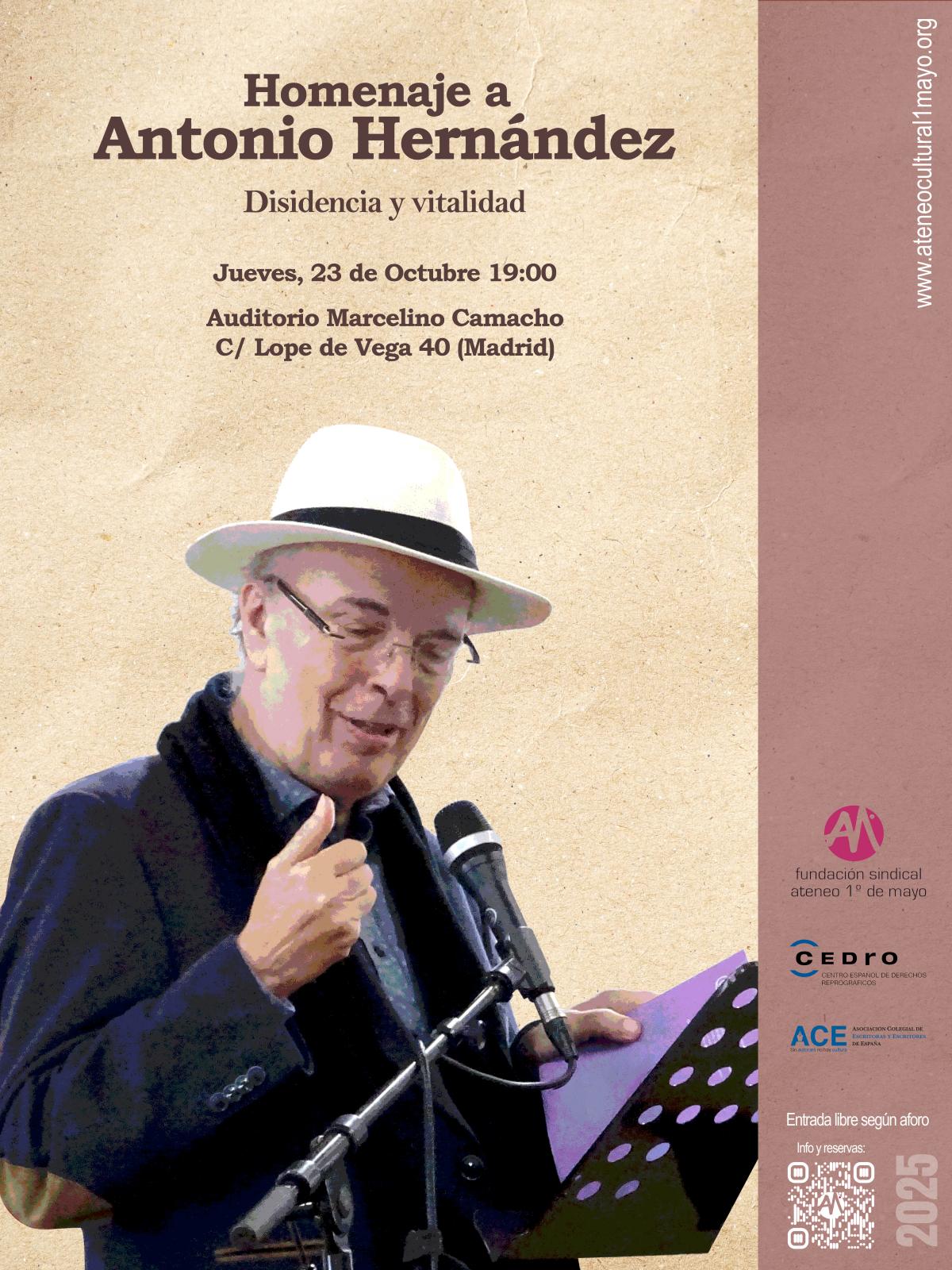 El jueves 23 de octubre a las 19:00, en el Auditorio Marcelino Camacho de CCOO Madrid (C/ Lope de Vega 40) se recordará al poeta, escritor y periodista Antonio Hernández, y también al amigo, recientemente fallecido, cuyo primer poemario (El mar es una tarde con campanas, accésit del premio Adonais en 1964), cumpliría este año sesenta de su publicación.