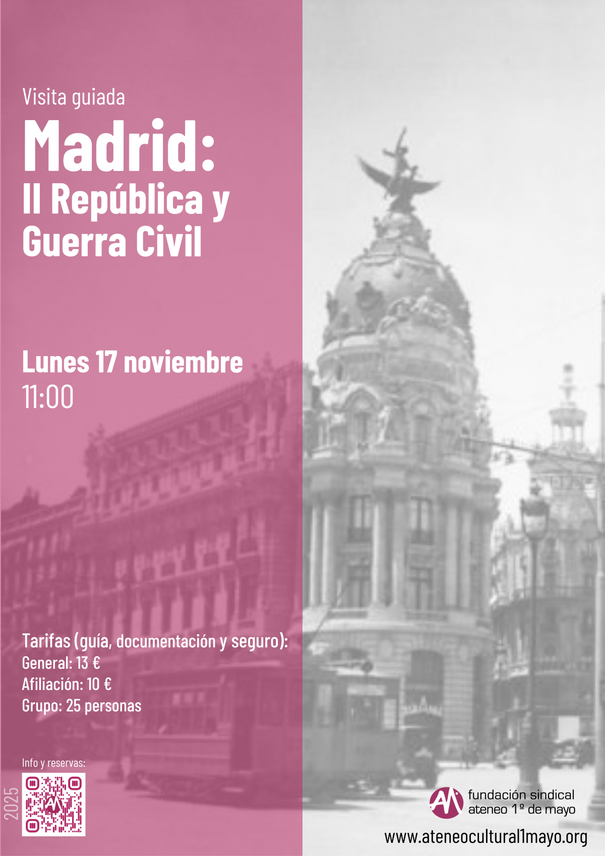 Los cafés en los que Federico García Lorca oficiaba sus tertulias, la extensión de la Gran Vía, la residencia de los presidentes de la República, vestigios de las bombas caídas en el centro histórico de la ciudad, los hospitales de sangre de la ciudad, el rescate y la salida de los cuadros del Museo del Prado… Todo ello y mucho más en un recorrido que nos trasladará a una época que aún late en nuestras calles. Acompáñanos en este paseo por la Historia de Madrid, buscando las huellas de lo que fue el Madrid de la II República y la castigada capital durante la Guerra Civil.