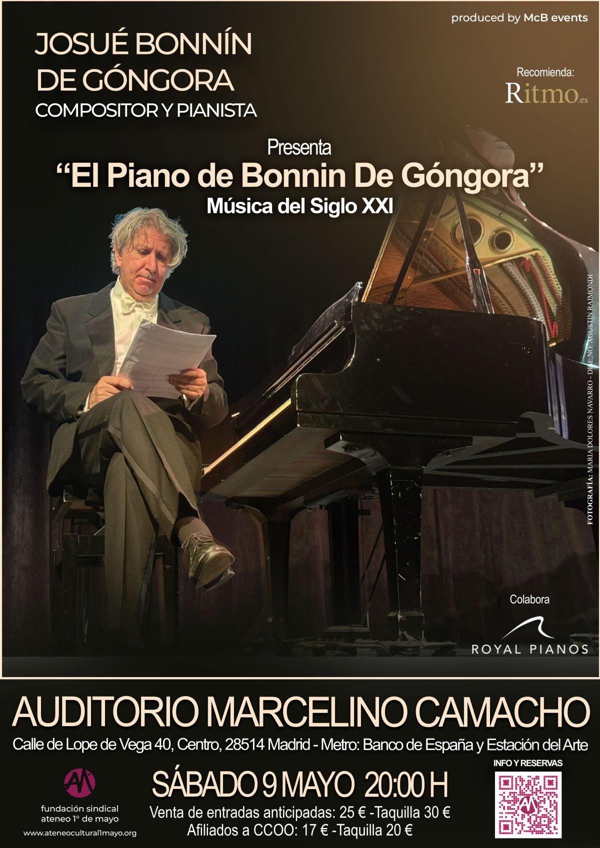Ven a deleitarte con El piano de Bonnín de Góngora al Auditorio Marcelino Camacho el sábado 9 de mayo a las ocho de la tarde. Puedes comprar tu entrada anticipadamente o en taquilla una hora antes.