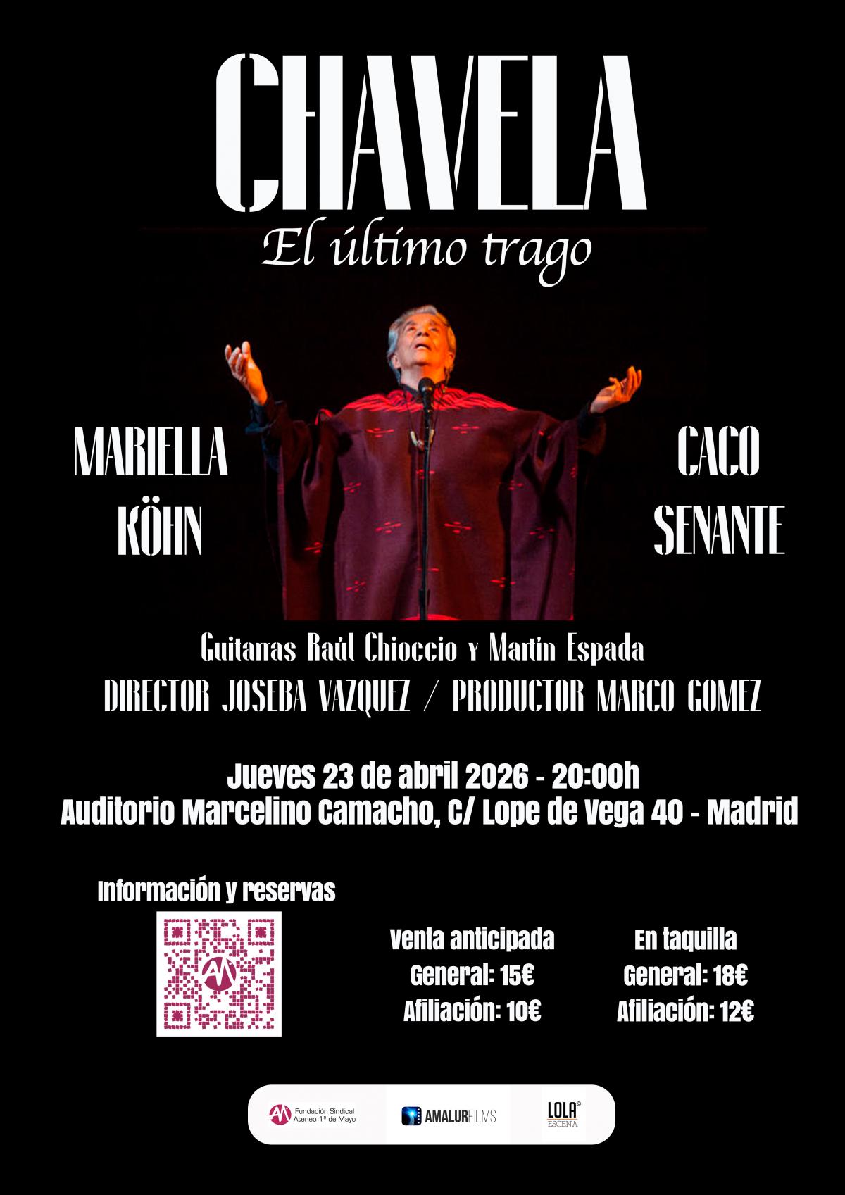 En el Auditorio Marcelino Camacho (C/ Lope de Vega 40, Madrid) sonarán una vez más (y seguro que no será la última) las canciones de la inmortal Chavela. Disfrútalas el jueves 23 de abril a las 20:00